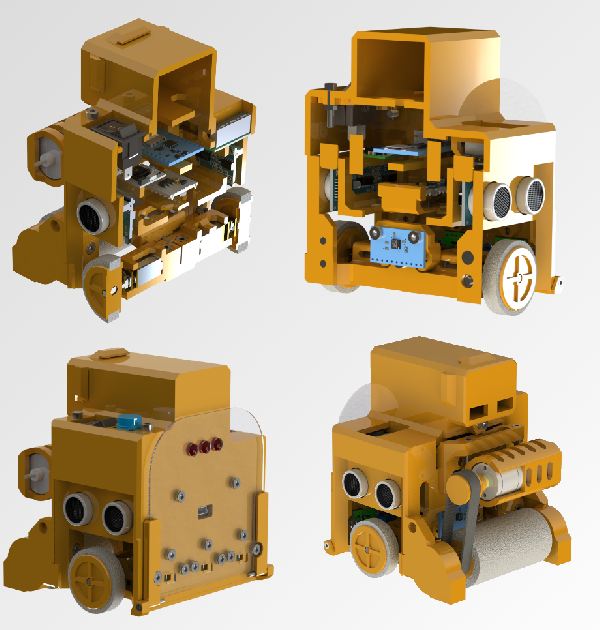 J'ai utilisé SolidWorks afin de réaliser le robot, préférent valider étage par étage, donner un accès pour téléverser le code rapidement utilisant une arduino nano, utiliser de la visserie afin de pouvoir démonter le robot, le rendre modulable, un accès batterie indépendant pour faciliter l'accès et le rechargement un afficher de la tension de la batterie LiPo (obligatoire dans le règlement) visible de l'extérieur, un bouton d'alimentation général, un bouton actionneur pour déclencher la séquence de combat, un buzzer pour un retour d'information (et un peu de fun), 3 leds en façade afin d'avoir un retour de données sur la détection. Au niveau des capteurs, nous souhaitions une vision précise devant nous avec 3 télémètres lasers en parallèle et une vision latéral global avec des capteurs ultrasons donnant une vision en cône bien plus large mais bien moins précise. Pour la propulsion, 2 petits moteurs pour les deux roues de devant afin d'avoir une traction guidée et un gros moteur en courroie à l'arrière au dessus d'une large roue, prenant un moteur coupleux et une roue avec une surface de contact à la table importante. La veille de la compétition, nous avons rajouté une rampe qui se deploie par mouvement, devant le robot, nous permettant de ne pas être poussé en face à face. Les roues ont été faites via un moule que nous avons modélisé, nous avons coulé du joint de salle de bain dedans. Après séchage, nous avions un cylindre que nous avons découpé selon notre besoin pour les roues de devant et celle de l'arrière. Niveau électronique, nous somme partie sur une batterie LiPo 11.1V 850mah, dimensionné pour nos composants, pilotage d'un pont H, et alimentation régulée par abaisseur de tension, nous avons utilisé actuellement toutes les sortie de l'arduino nano, j'ai également intégré au plus bas du robot et au centre un accéléromètre et un gyroscope afin de pouvoir faire un asservissement en déplacement mais nous n'avons eu de temps de l'implémenter . Le tout rentre tout juste, je l'appelle la boite de Pandore. Voici quelque image de vu du robot ainsi que d'une video d'un combat :